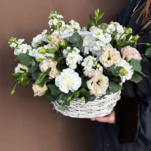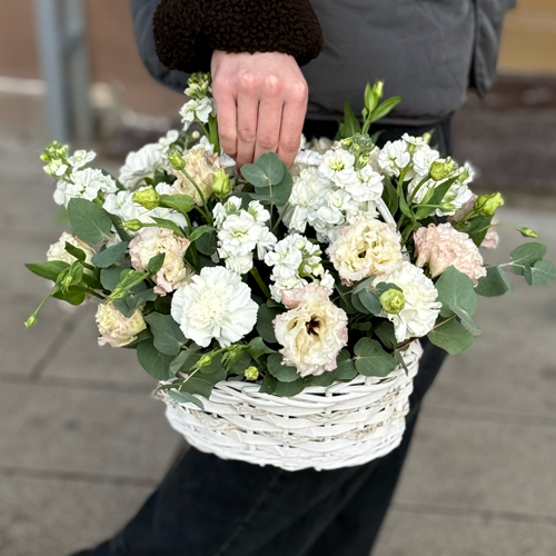 Композиция в корзине "Фея" из маттиол, диантусов, эустом и эвкалипта