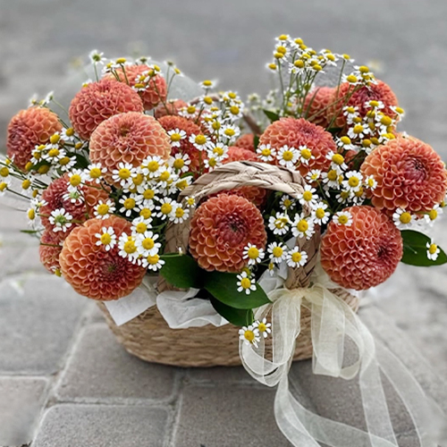 Композиция в сумке "Персиковый чиз" из георгин и ромашек