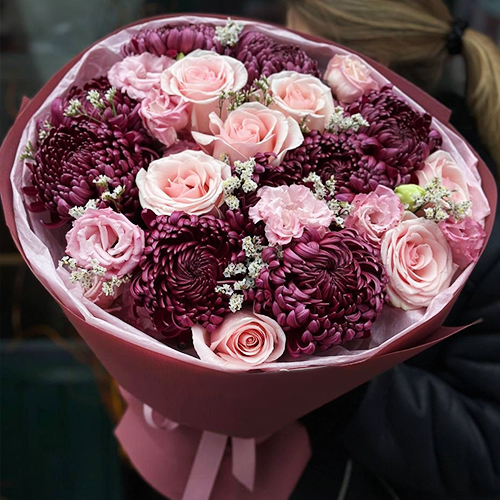 Букет "Романс" из хризантем Бигоуди, эустом, роз и лимониума