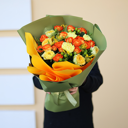 Букет "Осенний луч" из роз, гиперикума, альстромерий и диантусов